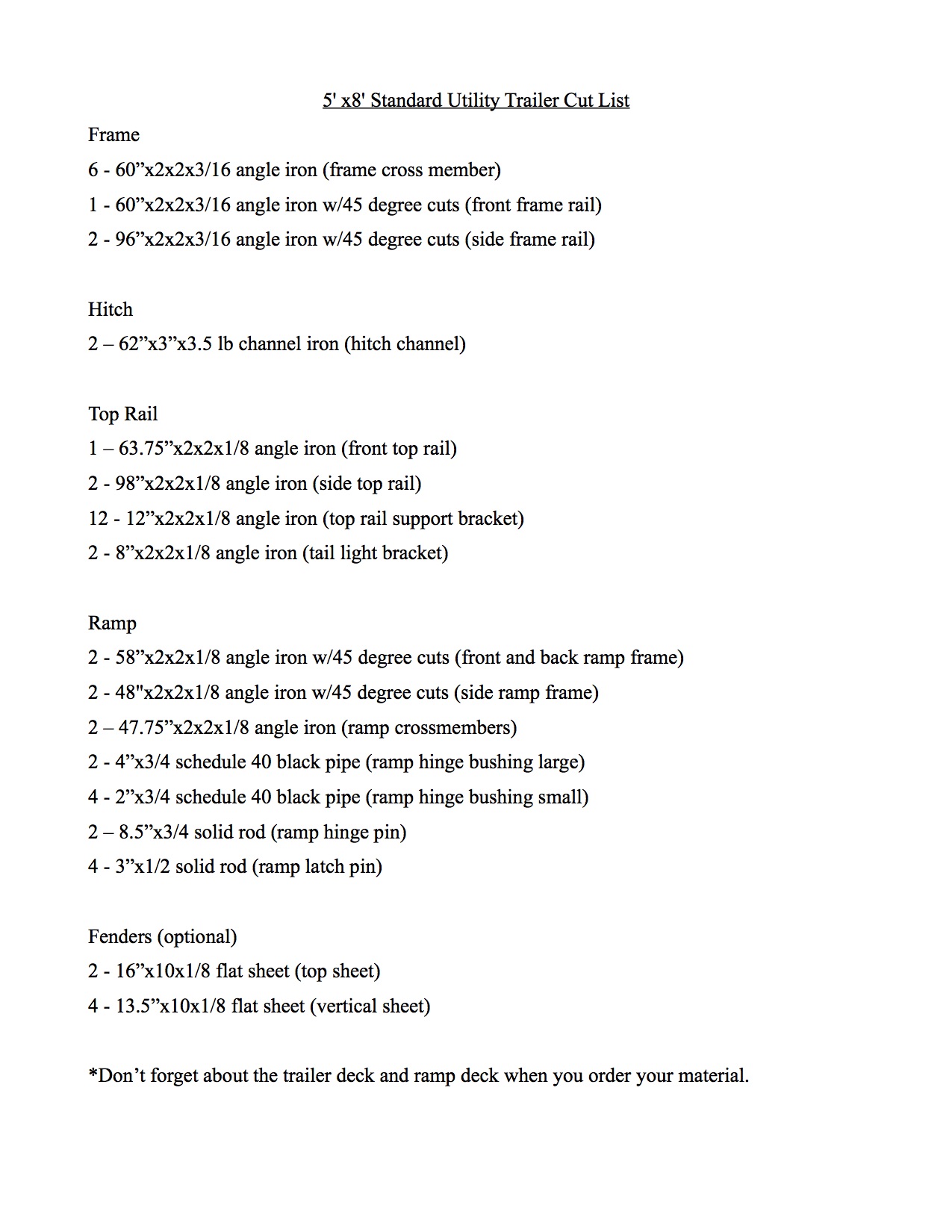 Red Wing Steel Works 5×8 utility trailer plans cut list